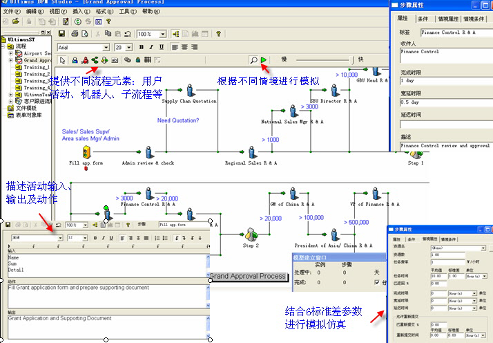 企业分析师:Ultimus Process Designer 可让企业分析师其它统计分析创建流程的模型。 他们可依照自己的判断定义各种实际情境,计算执行任务所需的资源、完成每项任务所需的时间以及各种可能影响结果的事件在流程中发生的机率。这些情境接着可应用在流程设计上,藉此来预测流程的行为、找出瓶颈所在以及探索各种优化流程的方法。