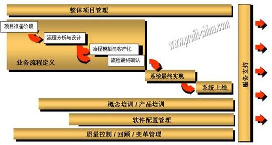 本公司人员从事IT咨询有多年系统实施的经验,并在实践中形成一套较为成熟的实施方法。此方法以用户 为中心,以用户的需求为出发点,将实施的各阶段文档化,从而在很大程度上能够确保实施成功。下面结合我们的经验和体会总结出如下实施方法论: